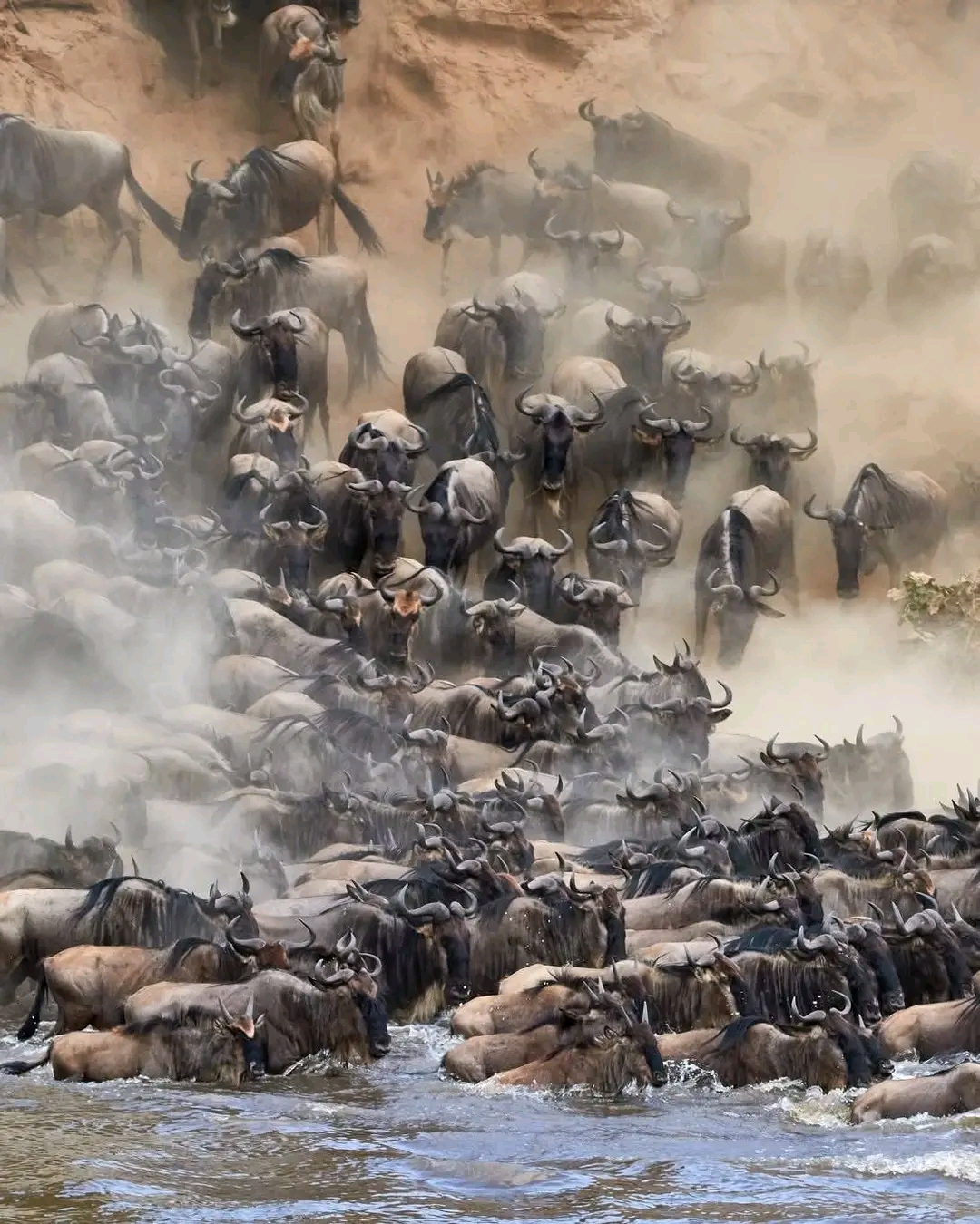 The Stampede: Once a critical mass decides to cross, it becomes a stampede. Wildebeest pour off the banks, sometimes from heights of 3-5 meters, plunging into the water in waves.