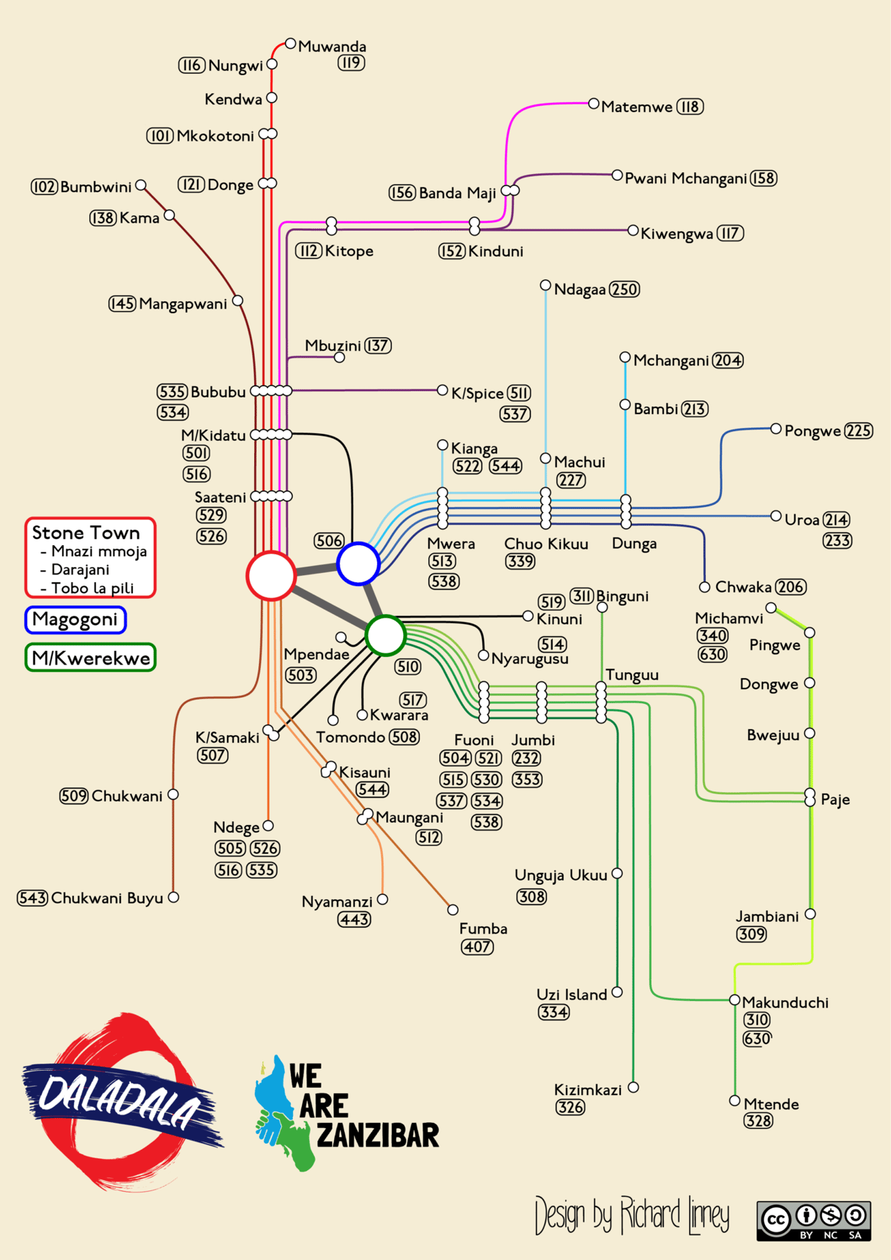 To our knowledge there has never previously been any kind of route map for Dala-Dalas, so after a few days of going cross-eyed staring at numbers and place names, and the frenzied yelling of those same place names still ringing in our ears, we are happy to present to you what we hope is a useful transport map to find your way around Zanzibar.
