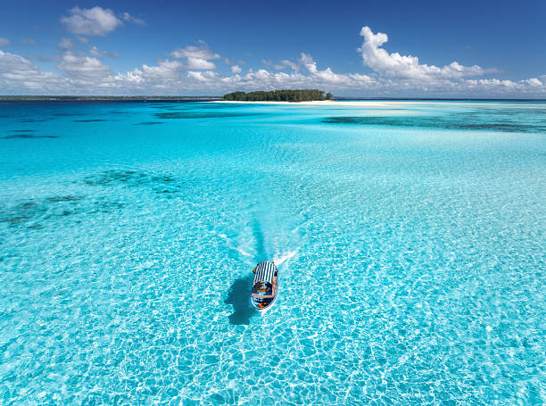 Boats for tourists in the crystal clear sea towards the idyllic Mnemba Island